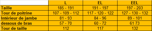 Tableau des tailles en CM:
