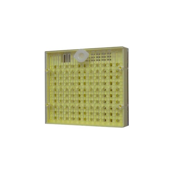 Système breveté supprimant le greffage. Réalisé en matière plastique alimentaire recyclable. Principe : par lintermédiaire de notre système, la Reine pond directement dans la cupule. Permet lélevage à partir de larves de 6 à 24 heures. Un Cupularve se compose de 3 pièces principales : - Une plaque alvéolée faite de 110 alvéoles de ponte (entourées dun dessin dalvéoles) et dune réserve à candi, pour introduction de Reine étrangère (1). Les 110 alvéoles recevront 110 cupules CNE3 (non fournies) ou 110 cupules en cire réalisées avec le cupule - moule de M. KEMP. - Une grille à Reine (2). - Une plaque dappui (3). Dimensions du Cupularve : 147 x 130 x 28 mm.